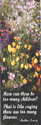 How can there be too many children?…is a bookmark that holds a beautiful quote from Mother Teresa: “How can there be too many children? That is like saying there are too many flowers.”
