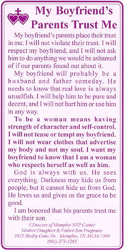 A card expressing a young woman’s commitment to treat her boyfriend with decency and honor and not do anything that he would be ashamed of if his parents knew.