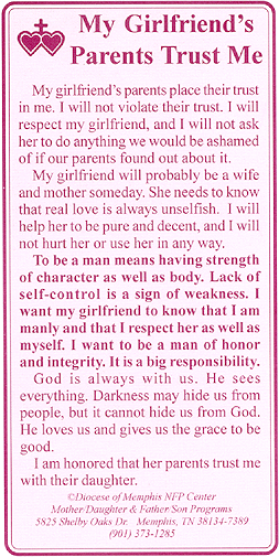 A card expressing a young man’s commitment to treat his girlfriend with decency and honor and not do anything that she would be ashamed of if her parents knew.