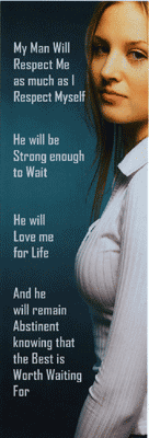 My Man Will is a chastity promoting bookmark for young women on being worth waiting for, beginning with the line “My man will respect me…”