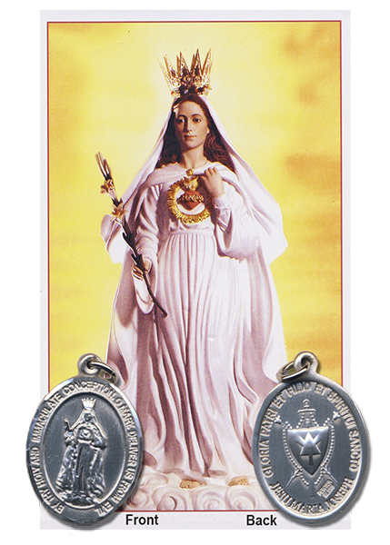Our Lady of America Silver Plated Medal. Size 3/4″ x 1″ With an image of Our Lady of America on one side and a coat of arms representing God’s plan for the Christian family on the other side.