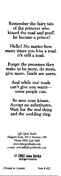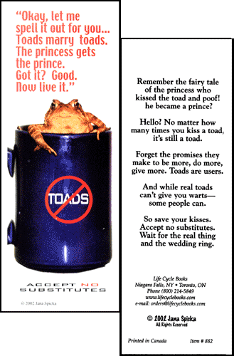 Toads Marry Toads is a chastity promoting bookmark. A toad looks out from a “No Toads” mug and says, “Okay, let me spell it out for you. . . Toads marry toads. The princess gets the prince. . .”